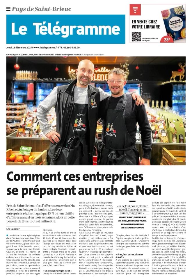 « Près de Saint-Brieuc, c’est l’effervescence chez Ma Kibell et Au Potager de Paulette. Les deux entreprises réalisent quelque 15% de leur chiffre d’affaires annuel en trois semaines. Alors en cette période de fêtes, tout est millimétré. »